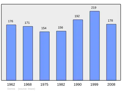 Według danych na rok 1990 gminę zamieszkiwały 192 osoby, a gęstość zaludnienia wynosiła 8 osób/km² (wśród 1545 gmin Langwedocji-Roussillon Dorres plasuje się na 717. miejscu pod względem liczby ludności, natomiast pod względem powierzchni na miejscu 294.).