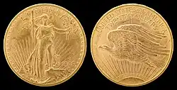 W 1905 roku prezydent Theodore Roosevelt poprosił swojego znajomego Augustusa Saint-Gaudensa o poprawę wizerunków amerykańskich monet. Saint-Gaudens zgodził się podjąć tego zadania za 5000 dolarów i w swoich pracach postanowił nawiązać do motywów ze starożytnej Grecji[25]. Awers projektu przedstawiał kroczącą personifikację wolności Miss Liberty z jedną stopą opartą o kamień. W swojej lewej dłoni trzymała głązkę oliwną, a w prawej pochodnię. Za postacią widniały promienie oraz budynek Kapitolu. Wzdłuż rantu sześcioramienne gwiazdy, nad Miss Liberty umieszczono napis „LIBERTY”. Rok wybicia zapisany cyframi rzymskimi został umieszczony na dole, po prawej stronie. Rewers tej odmiany przedstawiał lecącego w lewą stronę orła, który został zapożyczony przez Saint-Gaudensa z centa Flying Eagle. W tle za orłem widać promienie i słońce. Nad orłem, wzdłuż rantu nazwa państwa „-UNITED-STATES-OF-AMERICA-”, a pod nią nominał z nazwą waluty „-TWENTY-DOLLARS-”[26]. W trakcie bicia tej odmiany rozpoczęto jednocześnie prace mające poprawić jej wizerunek. W latach 1907–1908 bito monetę o spłyconym reliefie, rokiem zapisanym cyframi arabskimi oraz bez dewizy „In God We Trust”, co nie spodobało się prezydentowi[27]. W 1908 roku zmodyfikowano kolejny raz wizerunek monety. Dodano dewizę „IN-GOD-WE-TRUST”, która znalazła się nad obrysem słońca. Poprawiono również promienie słoneczne[28].