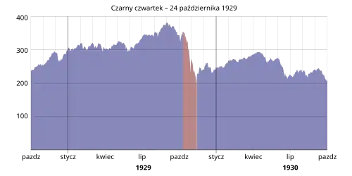 24 października 1929 roku przeszedł do historii jako czarny czwartek i był pierwszym dniem gwałtownej wyprzedaży akcji na nowojorskiej giełdzie. Mimo próby uspokojenia sytuacji następnego dnia, 28 i 29 października DJIA stracił kolejno 12,82% i 11,73%. Wyższy poziom niż ten przed krachem, indeks osiągnął dopiero w latach 50 XX wieku, czyli niemalże 30 lat po załamaniu[3].