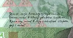 Fragment rękopisu wiersza Iwana Franki zapisany drahomanówką można zobaczyć na banknocie nominału 20 hrywien. Poniżej tekst tego fragmentu zapisany drahomanówką (po lewej) i współczesnym alfabetem (po prawej).