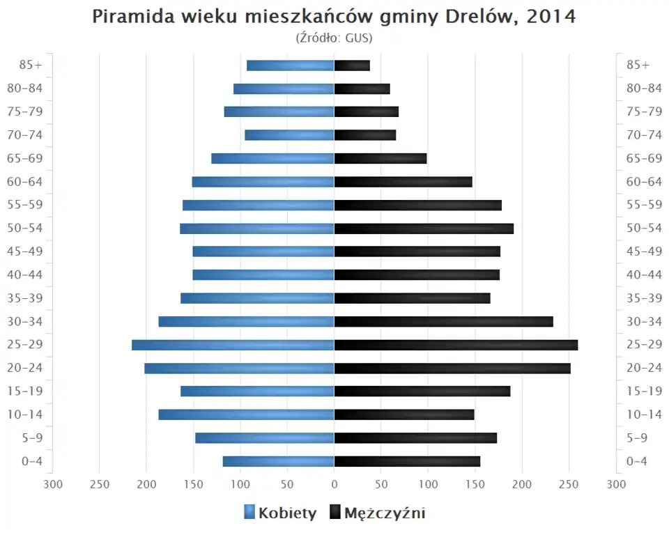 - Piramida wieku mieszkańców gminy Drelów w 2014 roku[10].