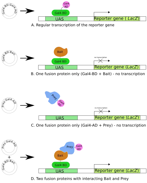 W drożdżowym systemie dwuhybrydowym domena wiązania DNA (BD) czynnika transkrypcyjnego GAL4 związana jest z białkiem „przynętą” (ang. bait), natomiast domena aktywatorowa (AD) GAL4 związana jest z białkiem „ofiarą” (ang. prey). Komórka syntezująca oba białka fuzyjne charakteryzuje się ekspresją genów reporterowych pod warunkiem, że badane białka (przynęta i ofiara) oddziałują ze sobą.
