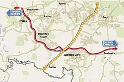 Omawiany odcinek zaczyna się od drogi wojewódzkiej 935 (ul. Raciborska) w Rydułtowach i będzie skierowany na południowy wschód. Przebiegnie po zachodniej stronie Rydułtów, następnie na wschodniej stronie Pszowa. Na teren Wodzisławia Droga Główna Południowa wejdzie przecinając ulicę Pszowską przy granicy z Pszowem. Od strony południowej droga minie dzielnice Wodzisławia Śląskiego: Kokoszyce, następnie przez Jedłownik, Marusze i Pustki przecinając drogę krajową 78. Następnie przebiegać będzie przez teren gminy Godów:Krostoszowice i Skrzyszów. Stamtąd powiedzie południową częścią gminy Mszana i włączy się do drogi wojewódzkiej 933 w niewielkiej odległości od granic Jastrzębia-Zdroju. Projektowany odcinek liczy 23,2 km. Na 18. kilometrze, czyli w pobliżu ulicy 1 Maja w Skrzyszowie trasa przetnie się z Autostradą A1. W ciągu drogi powstanie 8 wiaduktów, 7 węzłów drogowych, 2 mosty oraz 4 ronda. Droga na odcinku od autostrady A1 do DK78 w Wodzisławiu będzie posiadać 2 × 2 – dwie dwupasmowe jezdnie .