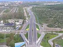 - ↑ Google: Widok ulicy. Mapy Google, 2018-06. [dostęp 2021-10-09]. – tablice drogowskazowe na węźle, widok w kierunku Gdańska