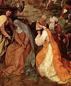Idąc łukiem w prawą stronę od sceny wyrywania Szymona z rąk żony, na pierwszym planie u dołu widać grupę lamentujących kobiet oraz Marię podtrzymywaną przez Jana Ewangelistę. Jest to jedyna grupa osób ubranych w stroje z epoki Chrystusa. To kolejny epizod wydarzeń wielkanocnych. Grupa stoi na skale, powyżej tłumu i będąc świadomym wydarzeń, górują nad całą sceną. Zupełnie po prawej stronie, za wysokim słupem, z ukrycia, upadek Jezusa obserwuje tajemnicza postać. Prawdopodobnie jest to autoportret malarza. Na szczycie słupa znajduje się koło, będące narzędziem tortur, a na nim siedzi kruk. Motyw ten często powtarza się w twórczości malarza, między innymi w Triumfie śmierci z 1562. Z prawej strony u dołu zamiast czaszki ludzkiej będącej symbolem wzgórza Golgoty, znajduje się czaszka końska[2].