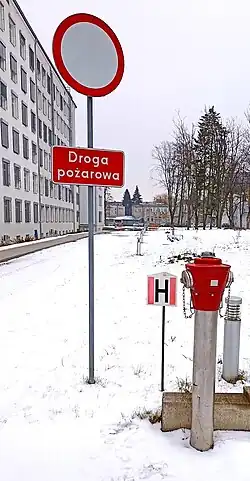 - ↑ § 12. ppoż. zaop. w wod. - Wymogi dotyczące drogi pożarowej - Rozporządzenie Ministra Spraw Wewnętrznych i Administracji w sprawie przeciwpożarowego zaopatrzenia w wodę oraz dróg pożarowych [online], arslege.pl [dostęp 2022-02-01] (pol.).