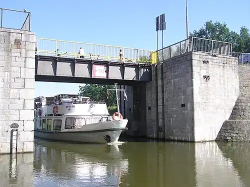 - ↑ choć nie są dostosowane, tak jak na Odrzańskiej Drodze Wodnej powyżej śluz Rędzin, do parametrów obowiązujących w europie zachodniej, szerokość śluz wynosi 9,6 m, wobec wymaganych 12 m – jednostki o standardowej w Europie szerokości mają 11,40 m.
