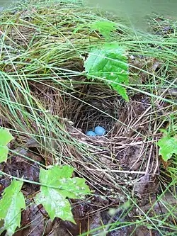 Gniazdo buduje samica, zwykle na ziemi lub nisko nad ziemią, rzadko wyżej niż 1,5 metra. Może ono spoczywać w kępie trawy lub innej miękkiej roślinności, na omszałym wzgórku, pod krzakami, na przewróconym pniu lub gałęzi. Samiec w tym czasie pilnuje terytorium. W zniesieniu 1–5 (najczęściej 4[7]) jaj koloru zielonkawoniebieskiego, czasami brązowo nakrapianych. Okres inkubacji trwa 10–14 dni. Młode są w pełni opierzone po 10–12 dniach od wyklucia[9].