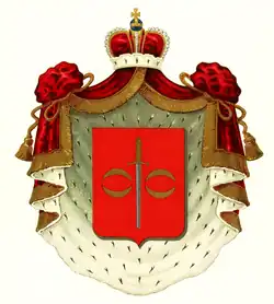 Całość otacza płaszcz heraldyczny, podbity gronostajem.