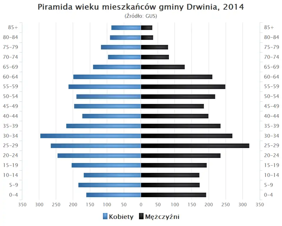 - Piramida wieku mieszkańców gminy Drwinia w 2014 roku[1].