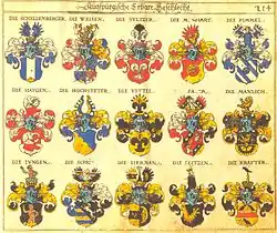 - ↑ Maximilian J. Kraus Die Familie des Ulrich Jung, Medicus und Duzfreund der Deutschen Kaiser na podstawie: Reinhard Wolfgang Augsburger Eliten des 16. Jahrhunderts, Akademie Verlag, Augsburg 1995; Grünsteudel Günther, Hägele Günter, Frankenberg Rudolf, Augsburger Stadtlexikon, Augsburg 1998; Hämmerle Albert, Die Hochzeitsbücher der Augsburger Bürgerstube und der Kaufleutestube bis zum Ende der Reichsfreiheit 1381 - 1806, München 1936; Paul von Stetten, Die Geschichte der adeligen Geschlechter der freyen Reichsstadt Augsburg, Frankfurt, Leipzig 1792; Nachlassakten von Fritz Lilienthal, in der Vereinsbücherei der Ortsgruppe Augsburg Siebmacher, Abgestorbener Bayer. Adel Band II Steuerbücher: 1400 – 1588