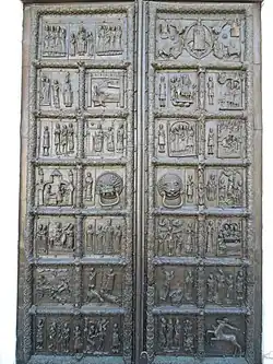Poszczególne części oryginalnych drzwi odlano z brązu osobno i przybito do drewnianych drzwi, co prawdopodobnie jest przyczyną zaburzenia pierwotnie przewidzianej kolejności. Płyty z przedstawieniami figuralnymi przedzielone są masywną bordiurą. Wykonano je z brązu, składały się z 24 kwater kwadratowych i 2 prostokątnych (kwatery o podwójnej szerokości wieńczące oba skrzydła drzwi), odlanych oddzielnie i zamocowanych na drewnianych dębowych ramach. Poszczególne kwatery są oddzielone wypukłymi listwami, ozdobionymi ornamentem roślinnym, który w górnej części pionowej listwy zastępują zbrojne postacie triumfując nad bestiami.