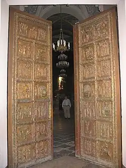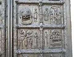 Reliefy przedstawiają cykl Zbawienia począwszy od sceny zbawienia pierwszego człowieka, aż po Chrystusa tronującego jako Sędzia w otoczeniu symboli ewangelistów. Olbrzymia część scen odnosi się do dzieciństwa Zbawiciela i jego pasji. Niezależnie od tego, pośród reliefów drzwi znajdują się też reminiscencje innych cyklów. Umieszczenie proroka Eliasza w wozie ognistym jest przypomnieniem równoległych wydarzeń Starego i Nowego Testamentu. W tym kontekście wóz Eliasza jest prefiguracją Wniebowstąpienia, choć umieszczoną w niewłaściwym miejscu.