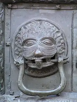 Kołatki osadzone w połowie wysokości skrzydeł przy wewnętrznej krawędzi, mają formę nieco uchylonych lwich paszcz, z których wystają główki ludzkie.