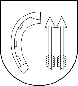 W polu barwy niewiadomej z prawej połupodkowa, z lewej dwie strzały ułożone w pas[1].