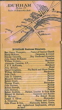 - ↑ T.J. Brown, Place-Names of the Province of Nova Scotia, [b.m.] 1922, s. 46; J.M. Cameron, Pictou county’s history, [b.m.] 1972, s. 271; Durham [online], Nova Scotia GeoNAMES Explorer – nsgi.novascotia.ca/geonames/ [dostęp 2022-03-05]; J.P. MacPhie, Pictonians at home and abroad. Sketches of professional men and women of Pictou county – its history and institutions, Boston, Massachusetts 1914, s. 21; Place-Names and places of Nova Scotia, Belleville, Ontario 1974, s. 179.