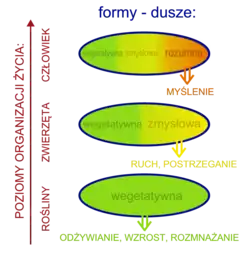 - dusza wegetatywna wiąże się z odżywianiem, wzrostem i rozmnażaniem; stanowi formę wszystkich istot żyjących: roślin, zwierząt i ludzi;