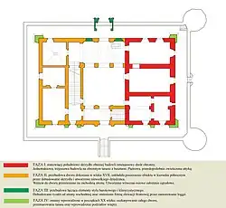 Budynek jest częściowo podpiwniczony. Na parterze znajduje się szereg dawnych pomieszczeń użytkowych i mieszkalnych, kaplica z pozostałościami wczesnobarokowych sztukaterii oraz szerokie jednobiegowe schody. Na piętrze znajdują się dawne pomieszczenia mieszkalne i reprezentacyjne oraz galeria arkadowa z kolumnami. Zachowały się kamienne portale drzwi.