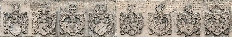Napisy nad herbami informują o stopniu pokrewieństwa ich posiadaczy z Danielem von Tschirbnaus[4].