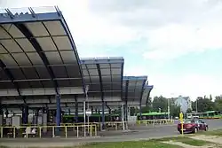Budynek dworca, z charakterystycznymi ekspresyjnymi wiatami nad peronami, został oddany do użytku 1 maja 1999. Autorem projektu była Pracownia Architektoniczna Ewy i Stanisława Sipińskich. Konstrukcja wisząca pięciu rzędów wiat opiera się na czterech pylonach-portykach, tworzących prostopadłe do peronów przejście dla pasażerów. Przejście to wieńczy piętrowy pawilon kasowy z poczekalnią i pomieszczeniami socjalnymi dla kierowców. Całość utrzymana jest w tonacji granatowo-szarej.