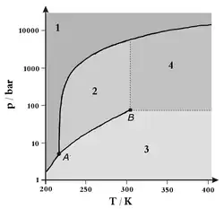Zależnie od wartości ciśnienia i temperatury dwutlenek węgla może występować w jednym z trzech stanów skupienia, w fazie gazowej, ciekłej (ciecz lub ciecz nadkrytyczna) lub stałej.