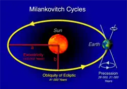 Zmiany aktywności słonecznej były obserwowane systematycznie od połowy XIX wieku (Samuel Heinrich Schwabe, Rudolf Wolf). W XX wieku promieniowaniem Słońca i mechaniką nieba zajmował się Milutin Milanković. Jego krzywa promieniowania słonecznego została spopularyzowana dzięki wykorzystaniu w pracy Wladimira Köppena i Alfreda Wegenera Die Klimate der geologischen Vorzeit (wyd, 1924)[70], z której autorami współpracował w czasie tworzenia podstawowych podręczników klimatologii i geofizyki (Handbuch der Klimatologie, wyd. 1939 i Handbuch der Geophysik, wyd. 1933)[71]. Jest znany przede wszystkim jako twórca nazwanej jego nazwiskiem koncepcji wiążącej cykliczne zlodowacenia Ziemi ze zmiennością ekscentryczności jej orbity, nachylenia osi obrotów względem ekliptyki i precesji (cykle Milankovicia)[72][73][74] (Canon of Insolation and the Ice-age Problem, wyd. 1941[75]). Alfreda Wegenera, autora pracy Die Entstehung der Kontinente und Ozeane (wyd. 1915), upamiętnia nazwa pierwszej teorii wędrówki kontynentów (Teoria Wegenera; zob. też historia listosfery i cykl superkontynentalny).