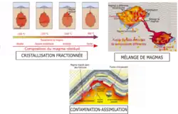 - frakcyjna krystalizacja magmy – wydzielanie się kryształów ze stopu magmowego w czasie krzepnięcia wskutek obniżania temperatury. Przebieg procesów spowodowanych frakcyjną krystalizacją magmy zależy od szybkości krzepnięcia magmy. Minerał wykrystalizowuje i jeżeli jest lżejszy - wędruje do góry, jeśli cięższy - do dołu (jest to dyferencjacja grawitacyjna, dotyczy ona również płynnej magmy, która rozdziela się na frakcje różniące się gęstością). W czasie frakcyjnej krystalizacji magmy występują trzy etapy: