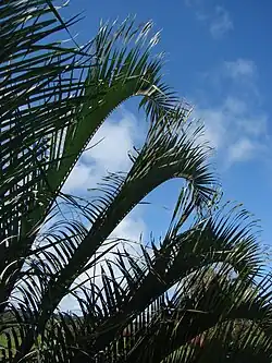 - Liście mają do 3,5 m długości i są pierzaste o niebieskawozielonej barwie. Z ich wierzchołków wyrastają długie włókna, które niekiedy sięgają aż do gruntu. Czasem na ogonkach liściowych występuje szary nalot[5].