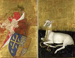 Na rewersach została również zachowana dwudzielność kompozycji oraz złote tło. W prawym skrzydle przedstawiono w profilu siedzącego na trawie białego jelenia ze złotymi rogami. Uwagę zwraca nałożona na szyję zwierzęcia złota korona, z doczepionym złotym łańcuchem, który zwierzę lekko przytrzymuje lewym przednim kopytem. Jest to osobisty symbol króla Ryszarda II.