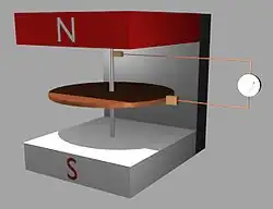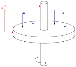 Urządzenie składa się z dysku wykonanego z przewodnika prądu elektrycznego, umieszczonego w stałym i prostopadłym do płaszczyzny dysku polu magnetycznym wytwarzanym przez magnesy. Podczas obrotu dysku, między środkiem a zewnętrzną częścią dysku powstaje napięcie (siła elektromotoryczna).