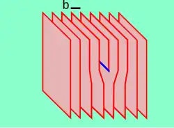 - dyslokacja krawędziowa – defekt polegający na wystąpieniu półpłaszczyzny krystalicznej między płaszczyznami sieci krystalicznej o prawidłowej budowie