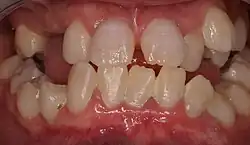 Dysplazja zębiny (ang. dentin dysplasia) – zaburzenie rozwoju zębiny. Wyróżnia się dwa typy schorzenia: typ I i typ II[2][3]. Dysplazja zębiny typu I polega na szczątkowym wykształceniu korzeni zębów. Na obraz kliniczny choroby składa się wczesna utrata uzębienia stałego i towarzyszący niedorozwój szczęk. Na radiogramie można stwierdzić skrócenie korzeni zębów i nieprawidłową morfologię tych części zębów, z obecnością punktowej zwiększonej przejrzystości lub torbieli. Kanały korzeni zwykle są nieobecne, komora miazgi jest częściowo lub całkowicie zamknięta. Kolor i morfologia uzębienia mlecznego i stałego są zazwyczaj prawidłowe, chociaż niekiedy zęby mogą być matowe, niebieskawe lub brązowawe. W typie II zęby mleczne są brązowawe lub niebieskawe, komora miazgi jest nieobecna; zęby stałe mają prawidłową morfologię (kształt i wielkość) i barwę lub są delikatnie przebarwione, w komorze miazgi mogą być obecne kamienie (ang. pulp stones)[4]. Leczenie polega na zastosowaniu implantów.