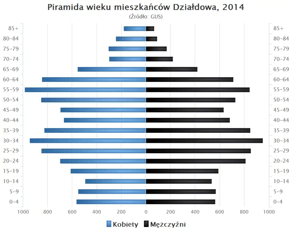 - Piramida wieku mieszkańców Działdowa w 2014 roku[27].