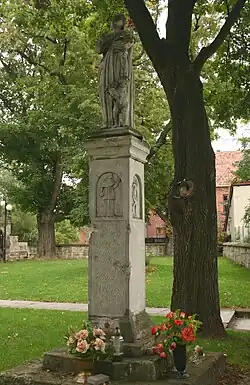 - Kamienna figura św. Rozalii na słupie, na którym na jego czterech ścianach płaskorzeźby św. Rocha, Karola Boromeusza, Sebastiana i Ignacego oraz (z frontu) suplikacja "Od powietrza, ognia i wojny wybaw nas Panie". Wykonana została w 1848 r. przez Józefa Zaborowskiego.[28]