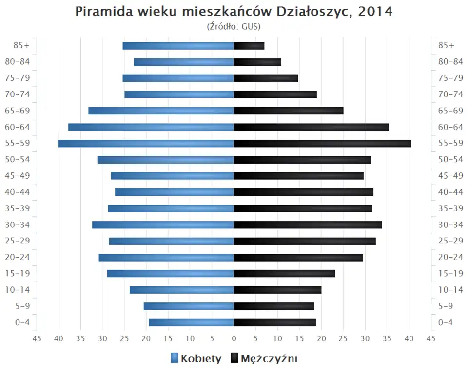 - Piramida wieku mieszkańców Działoszyc w 2014 roku[32].