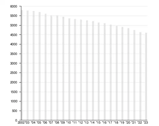 Wykres zmian liczby ludności gminy Działoszyce w latach 2002-2023