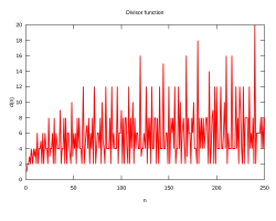 Liczbę wszystkich dzielników dodatnich liczby określa funkcja tau przykładowo Obok podano jej wykres dla argumentów nieprzekraczających 250.