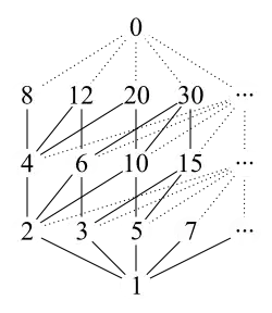 - Ten konkretny poset należy do krat, ponieważ dla każdej pary liczb naturalnych istnieją największy wspólny dzielnik (NWD) oraz najmniejsza wspólna wielokrotność (NWW), pełniące role kresów – odpowiednio dolnego (infimum) i górnego (supremum).