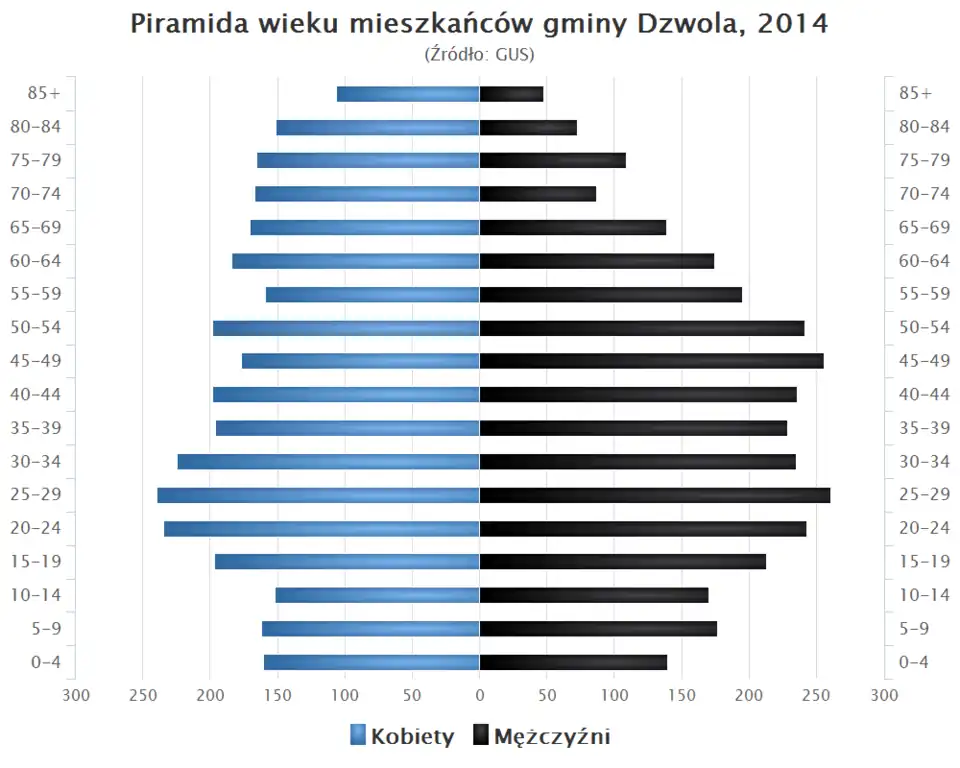 - Piramida wieku mieszkańców gminy Dzwola w 2014 roku[5].