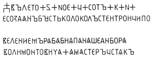 Na korpusie znajduje się dobrze czytelny napis w języku starosłowiańskim: "W leto 6000 9 sot 28 sozdan byst kołakoł swiatoj Trojcy powieleniem raba bożia pana Szedibora Wolimuntowicza a master Ustiak". Rok 6928 ery bizantyjskiej odpowiada rokowi 1420 po Chrystusie. Przed tekstem napisu znajduje się litewski herb Wolimuntowiczów.