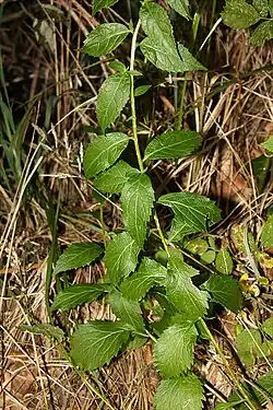 - Ulistnienie skrętoległe. Liście odziomkowe na długich ogonkach i dość wcześnie obumierające, dolne łodygowe krótkoogonkowe, podłużnie jajowate, o piłkowanych brzegach, górne lancetowate i prawie całobrzegie. Na spodniej stronie (szczególnie na nerwach) owłosione krótkimi i szorstkimi włoskami[7].