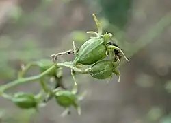 - Odwrotnie gruszkowata, kanciasta torebka otoczona wieńcem trwałych działek kielicha. Otwiera się trzema otworami przy nasadzie. Nasiona brunatne, drobne, wąsko oskrzydlone, o długości do 1,7 mm[8].