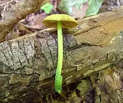Wysokość 2–8 cm, grubość 1,5–4 mm, cylindryczny lub nieco spłaszczony, czasami wyraźnie rozszerzający się w kierunku podstawy, początkowo o barwie żywozielonej, później brązowiejący, czasami z niebieskawym odcieniem. Uszkodzony szybko zmienia barwę na niebieskozieloną, zwłaszcza w dolnej części. Powierzchnia naga, błyszcząca, z białą, filcowatą grzybnią u podstawy[4].