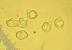 Różowy. Zarodniki 9,0-11,5 × 7,0-8,5 µm, kanciaste, z widoczną porą rostkową[4].