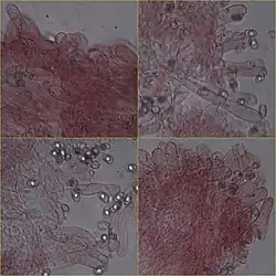 Zarodniki w zarysie elipsoidalne, kanciaste, 5–9-kątowe, o wymiarach 9,0–11,5 (–12,5) × 6,0–8,0 (–9,0) μm. Podstawki 27–48 × 8–11 μm, 4–zarodnikowe, rzadko 2-zarodnikowe, ze sprzążkami. Cheilocystydy o kształcie od cylindrycznego do maczugowatego i rozmiarach 16–60 (–110)× 8–15 μm. Komórki skórki cylindryczne lub lekko rozdęte, o szerokości 8–20 μm z maczugowatymi elementami końcowymi o szerokości do 25 μm. Występuje w nich wewnątrzkomórkowy brązowy pigment. W tramie kapelusza błyszczące granulki. W strzępkach brak sprzążek[4].