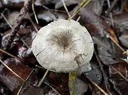 Średnica 0,8–4 cm, początkowo wypukły, potem płaskowypukły z wklęsłością, dość szybko lejkowaty. Brzeg początkowo silnie podgięty, potem wyprostowany i nieco pofalowany. Jest niehigrofaniczny, w stanie wilgotnym nieprzeźroczysty i nieprążkowany. Barwa ciemnoszaro-brązowa, z wiekiem blednąca, czasami blado szarobrązowa od samego początku. Powierzchnia gęsto promieniście włókienkowata, o włókienkach srebrzysto-szarych, przylegających lub luźnych, z jedną lub kilkoma koncentrycznymi strefami. Jest błyszcząca, zwłaszcza w stanie suchym[4].