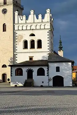 Znajduje się w centralnej części wrzecionowatego rynku miasta. Jest usytuowana niesymetrycznie zarówno w stosunku do osi rynku jak i osi kościoła. Została zbudowana w 1659 r. w kształcie prostopadłościennej, dwukondygnacyjnej wieży nakrytej dachem pogrążonym i zwieńczonej typową dla wschodniosłowackiego renesansu attyką. Podstawę attyki tworzy fryz arkadkowy ze ślepymi arkadami. Kondygnacje rozdziela wąski gzyms. Na piętrze, pełniącym rolę izby dzwonowej, podwójne lub potrójne oka zamknięte u góry półkoliście. Po stronie południowej dobudówka ze schodami, wiodącymi na piętro.