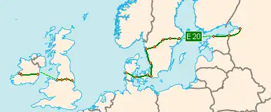 E20 – trasa europejska bezpośrednia zachód-wschód, podstawowa (kategorii A). Zaczyna się na lotnisku Shannon w Irlandii, kończy się w Petersburgu w Rosji. Na trasie znajdują się dwa płatne mosty. Łączna długość trasy wynosi 3164 km.