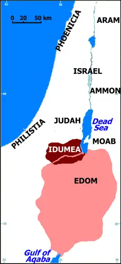 Edomici byli blisko spokrewnieni z Izraelitami. W V wieku p.n.e. zostali wyparci ze swoich siedzib przez arabski lud Nabatejczyków i osiedlili się w części Judy, na południe od Hebronu. Ich bogiem plemiennym był Kaus (także Kos). Według Księgi Rodzaju ich protoplastą był Ezaw (sam także nazywany Edomem), wnuk patriarchy Abrahama, brat Jakuba, zwanego później Izraelem[6].