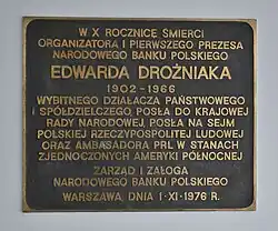 - Tablica odsłonięta w 1976 przy wejściu głównym do gmachu centrali Banku przy Świętokrzyskiej 11/21 w Warszawie.